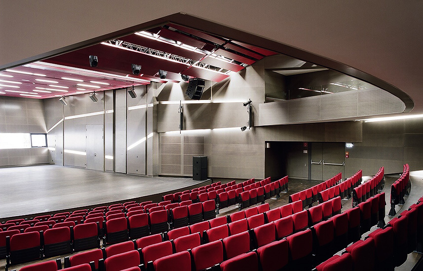 Durch die flexible Anordnung von mobilen Schiebewänden kann der Saal und seine Hinterbühne als klassische Guckkastenbühne oder als Raumbühne genutzt werden. Die Doppelnutzung der Hinterbühne als Bewegungsraum für die Schule und als Mehrzwecksaal ist durch die mobilen Trennwände wieder gegeben. Das Saalparkett kann eingeebnet werden, was eine Nutzung als Ballsaal ermöglicht.
