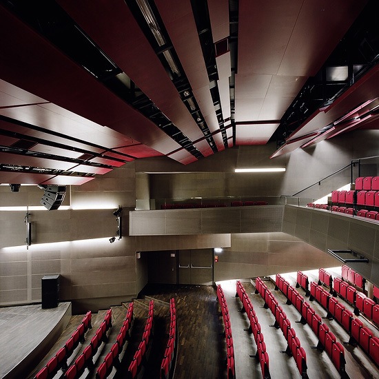 Das Theatercafe im Zugangsgeschoß, welches in Doppelnutzung zur Tagesversorgung des Schulzentrums dient, ist durch eine großzügige Verglasung im Straßenraum gut sichtbar und schafft für die Stadt einen zusätzlichen Treffpunkt und Ort der Begegnung. Architektentext