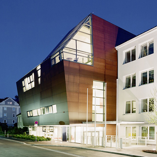 Die kristalline Form des Zubaues setzt im Stadtraum ein deutliches Zeichen und akzentuiert durch das Vorspringen des Saalgeschoßes den vor der Schule befindlichen Platz neu. Verschiedene baurechtlich erforderliche Rücksprünge und Abschrägungen wurden gestalterisch dazu genutzt, dem Baukörper eine außergewöhnliche, der Nutzung als Veranstaltungsort gerecht werdende, Form zu geben.