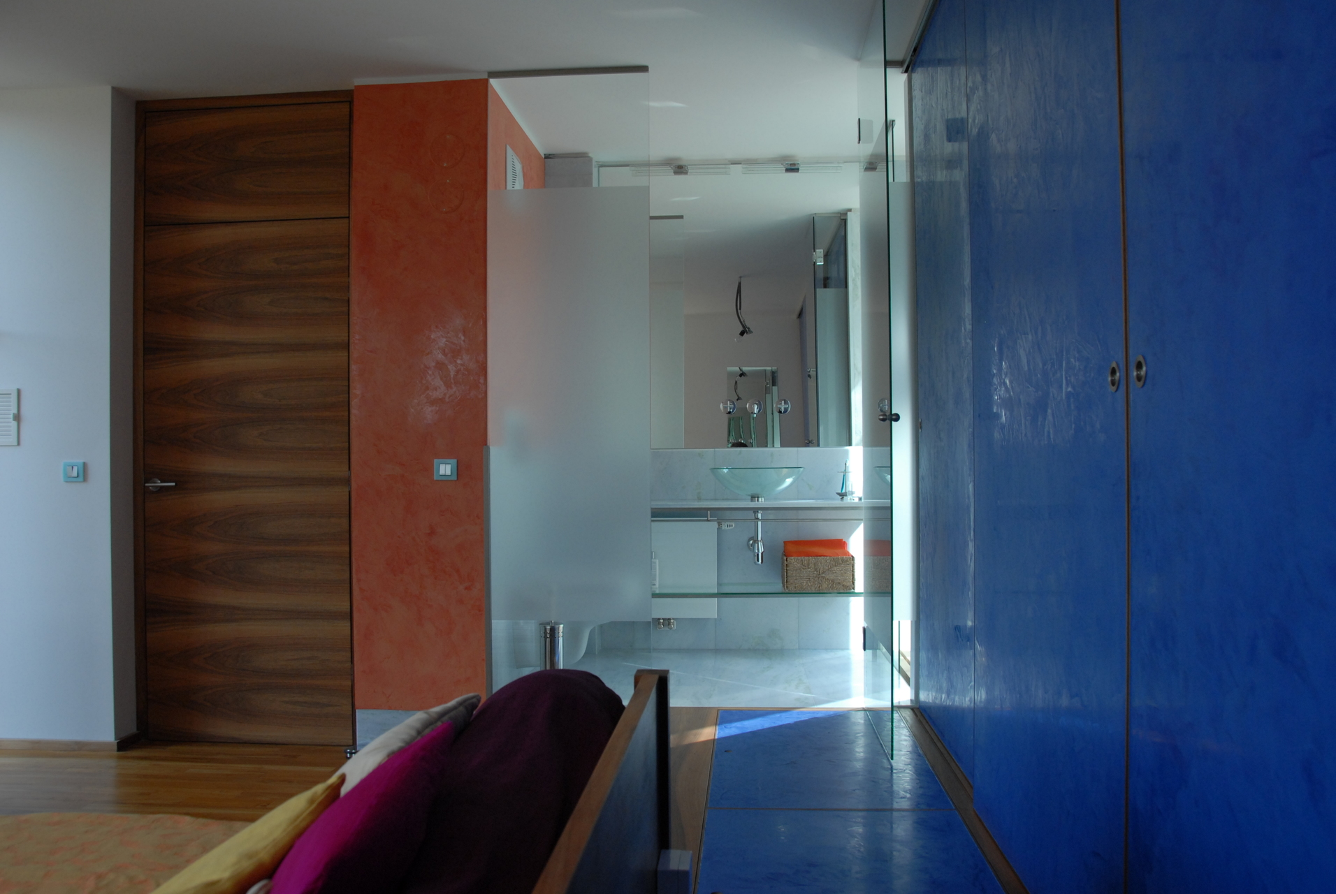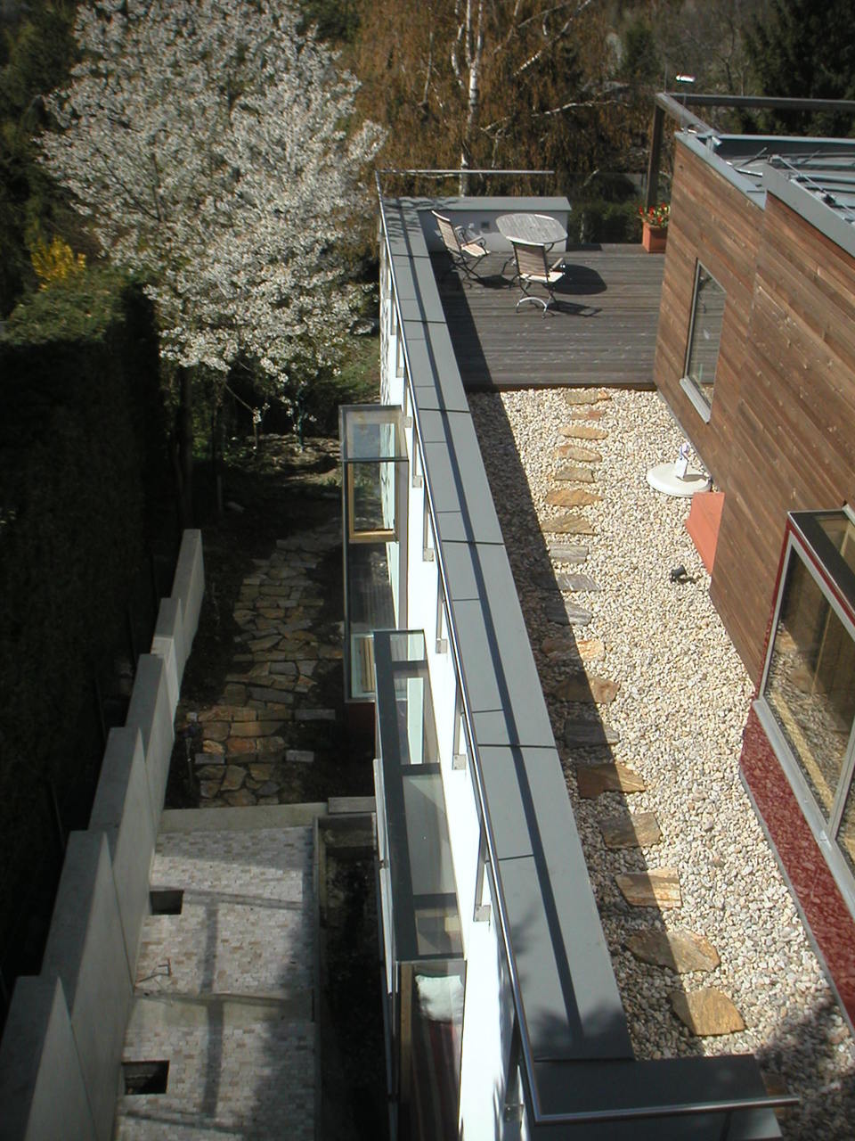 Eine frei liegende Treppe führt in den Wohnraum hinunter. Beim Hinuntergehen gibt die vollflächige 5M hohe Verglasung der Westfassade den Blick auf die Landschaft, die vorgelagerte Holzterrasse und den Garten mit Teich frei. Über der Treppe ist ein Oberlichtband über die gesamte Fassadenlänge geführt. Senkklappfenster verhindern sommerlichen Wärmestau. Vom zentralen Wohnbereich sind drei Schlafzimmer begehbar, deren größtes mit einem Badezimmer ausgestattet ist. Hangwärts gelangt man in einen großzügigen Wellnessbereich. Der Saunahof mit einem Steinbrunnen hilft beim Entspannen.