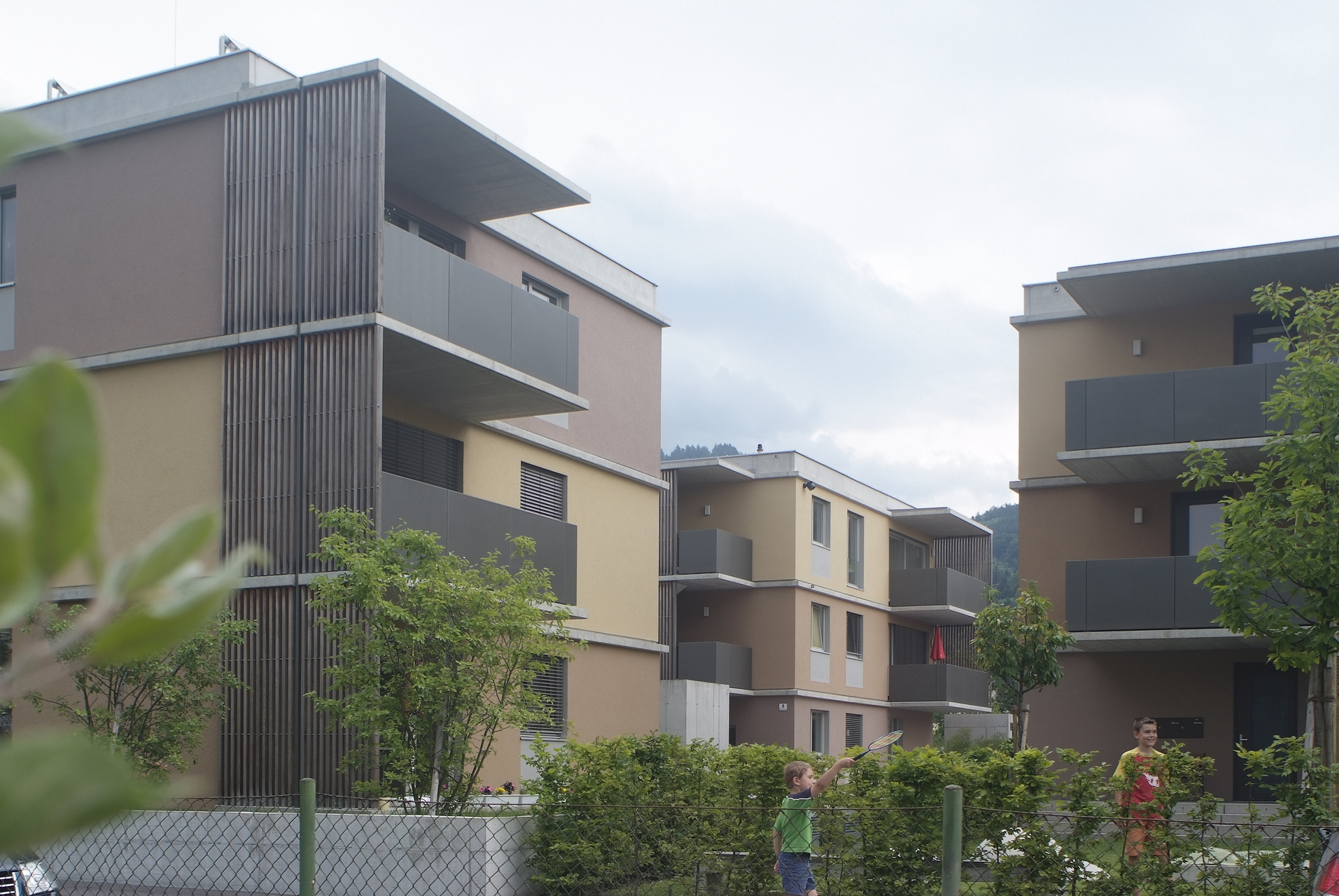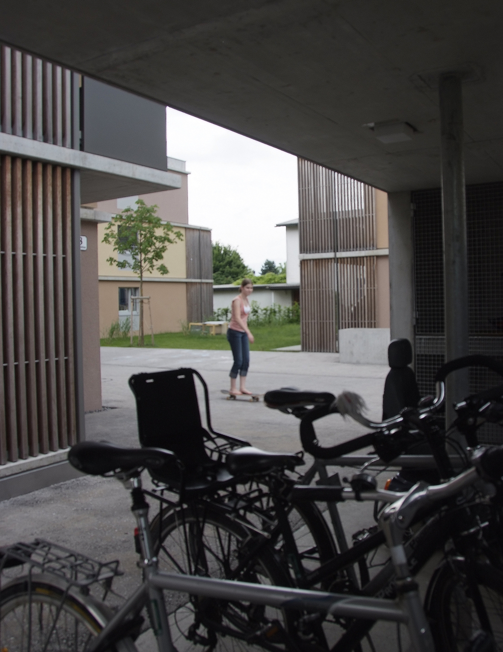 Ein Auto-Teilen Konzept sollte die Autoabstellplätze minimieren, aber vor den gesetzlichen Vorschriften gab es kein Entrinnen. So steht heute die Autogarage leer und die sehr angenehm integrierten Fahrradabstellplätze quellen über. Gemeinsam genutzt wird auch ein Aufenthaltsraum mit 30 m². Jedes Haus ist unterkellert und bietet ein großzügiges Lagerabteil und Raum für die gemeinsame Haustechnik wie kontrollierte Be- und Entlüftung und Pelletsheizung. Im Erdgeschoss und in den zwei Häusern mit Lift wird durch Barrierefreiheit Öko 2 Standard erreicht. (Text: Martina Pfeifer-Steiner)