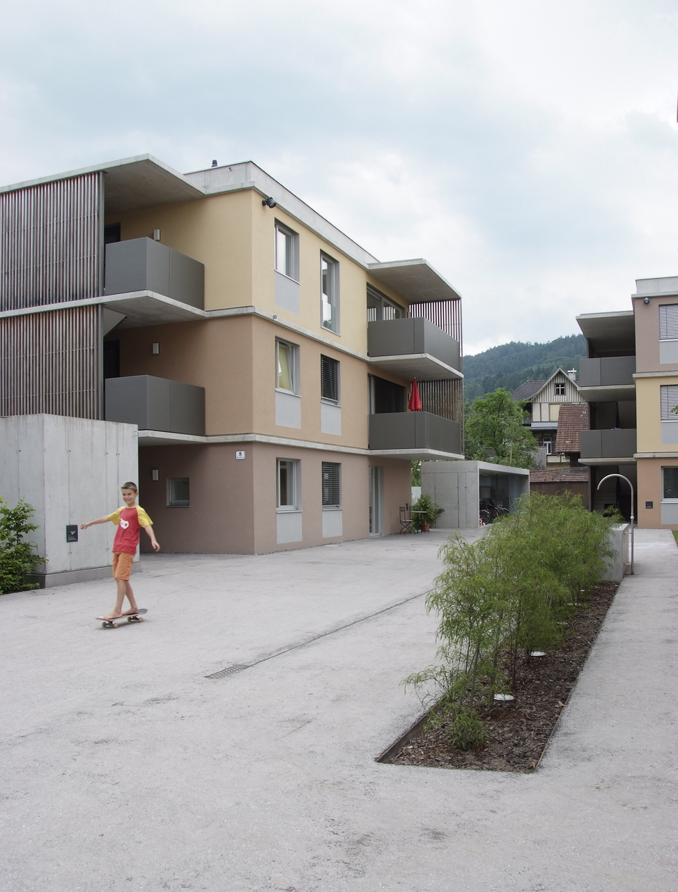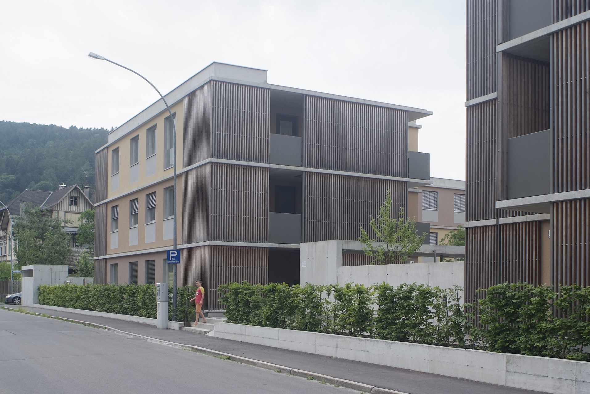 In der Materialwahl, mit den Holzlatten, Gesimsen, die den Baukörper stark gliedern und in der Farbigkeit, den Übergängen und Details wird sehr überlegt auf das Umfeld reagiert. Die Maßstäblichkeit ist auf allen Ebenen eingehalten.