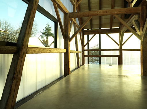 Im Sinne zeitgemäßer Anforderungen und Architektur wird die Stadel-Außenhaut in profillosen Polycarbonatpaneelen ausgeführt. Sie interpretiert mit der homogenen Oberfläche die alte Bretterfassade und ermöglicht durch Lösungen zur Thermik und Lichtsituation die neuen Inhalte. Nach Außen wird die alte Konstruktion durch die transluzente Hülle sichtbar.
