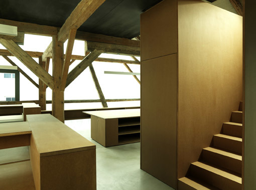 Der Eingang im Norden erschließt den gesamten offenen Raum. In die bestehende Holzkonstruktion wird eine zusätzliche Ebene eingezogen und ein freistehender schwarzer Monolith, der sich turmartig bis unter das Dach erhebt, knickt dort zu einer offenen Galerie, die als Besprechungsraum genutzt wird, in die Horizontale ab. Der großzügige Arbeitsraum wird durch die transluzente Polycarbonat-Hülle und gezielte Glas und Fensteröffnungen mit Licht durchflutet.