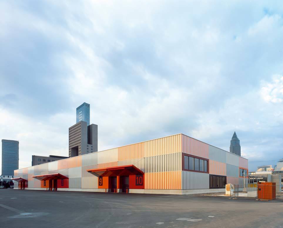 In diesem prominenten Umfeld nimmt das im Jahr 2007 fertiggestellte Cargo Center von Kölling Architekten eine besondere Stellung ein, sollte doch die Nutzung als Logistikzentrum inmitten der Ausstellungshallen auch für Messebesucher deutlich ablesbar sein. Dem Masterplan des Frankfurter Architektur- und Stadtplanerbüros Albert Speer und Partner (AS&P) folgend, bildet das Cargo Center den Auftakt für den jüngsten Bauabschnitt auf dem Areal im Südwesten des Messegeländes. Die Halle, die sich mit ihrer Hauptfront zur Ausstellungsfläche orientiert, schafft auf der Ostseite zum Bahnkörper hin einen vom Freigelände aus nicht einsehbaren Vorbereich, der als Rangier- und Ladehof genutzt wird. Als Antwort auf die Heterogenität der benachbarten Bauten entwickelten Kölling Architekten eine 130 x 42 Meter große Halle, die die Maßstäblichkeit der benachbarten Messehallen aufgreift, sich durch die Gestaltung der Fassade aber deutlich von ihnen unterscheidet.