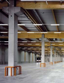 Die anthrazitfarbene, glatt geschliffene Putzfassade des auf der Ostseite der Halle angefügten Verwaltungstraktes hebt sich klar ab. Sie greift zwar das Anthrazit der Fassadenprofile und Tore sowie in den Fensterlaibungen das Material Blech wieder auf. Doch die Höhenstaffelung der Lochfassade scheint nicht mit der Halle zu korrespondieren. Insbesondere die Fensterbrüstungen nehmen keine erkennbaren Bezüge zur vertikalen Gliederung der Lagerhalle auf. Unter funktionalen Gesichtspunkten hingegen sind Halle und Verwaltungstrakt sehr gut aufeinander bezogen. Die Architekten setzen hier das Konzept der kurzen Wege bei geringem Flächenverbrauch konsequent um. Der viergeschossige Bürotrakt spannt sich als Torhaus über den abgesenkten Ladehof und schafft auf diese Weise einen geschützten Vorbereich für die Anlieferung. Die Waren werden hier entweder zwischengelagert oder direkt über die Tore auf der gegenüberliegenden Seite auf dem Messegelände verteilt.