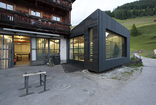 In einem abgelegenen Tal in Osttirol ist mit diesem Anbau an eine alteingesessene Schmiede im Dorfkern eine zeitgemäße Erweiterung auf einem nahezu unbebaubaren „Zwickel“ zwischen bestehendem Haus und Wildbach geglückt, der für die Mitarbeiter der Schmiede optimale – im Gegensatz zur ursprünglichen Werkstatt im bestehenden Gebäude tagesbelichtete – Arbeitsbedingungen schafft und so die Tradition des Familienbetriebs in der intakten Dorfstruktur fortführen hilft.