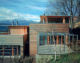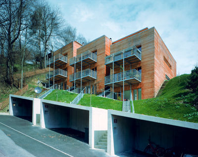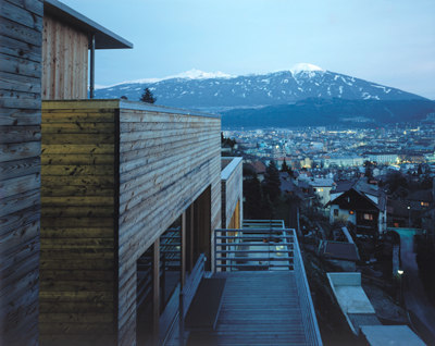 Mit drei gestaffelten Turm-Terrassenhäusern für eine Errichtergemeinschaft widerlegt der Architekt die gängigen Annahmen, dass die derzeit nicht nur in Westösterreich boomende „hölzerne“ Kiste mit Niedrigenergiewerten zu räumlich langweiligen Schematismen führt und dass die Bebauung der Nordhänge Innsbrucks zwangsläufig die natürliche Topographie stört.