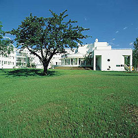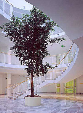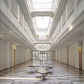Der Haupteingang führt in eine zentrale Halle, in der die öffentlichen, dreigeschossig angelegten Erschließungshallen zusammenlaufen. Westlich des Eingangs sind die Büroräume in dreigeschossigen Trakten um zwei Höfe angeordnet. Die Sonderfunktionen (Schulungszentrum, Beherbergungen, Kantine) bilden eine eigene Einheit östlich des Eingangs, sind aber mit den Büros in den Obergeschoßen verbunden.