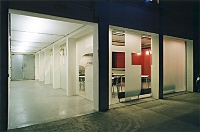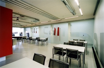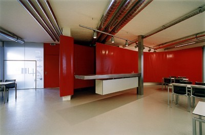 Die Wegführung vom Foyer erfolgt linear durch die „can't tin“ in die Erschließungszone weiter zu Lager und Produktion. Dadurch wird die Verkehrsfläche optimiert und großzügig Raum geschaffen. Die Erschließungszone wird mittels einer Lichtdecke aus Projektionsfolie und asymmetrisch gesetzten Leuchtschienen aufgehellt. Die Wände korrespondieren sowohl mit den Funktionen der angrenzenden Durchgänge - Lager und Produktion - als auch den Sichtbeziehungen und fungieren als Leitsystem. Der signalrote Farbakzent wird aufgenommen und von der Fläche in die Schriftzeichen abstrahiert. Durch Glas, Tragstruktur, Leitsystem und Wand entstehen Schichtungen unterschiedlicher Dichte und Prägnanz, die je nach Fokus im Vorder- oder Hintergrund liegen. (Text: Architekten)