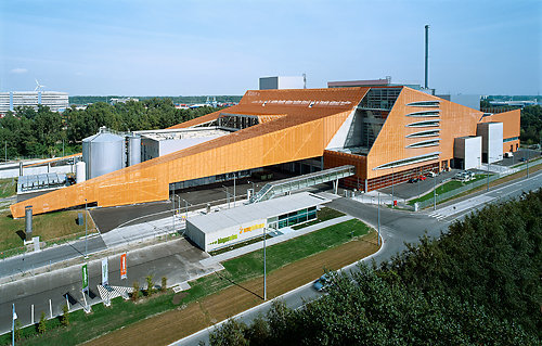 Es wollen einem keine überzeugenden Metaphern einfallen, wenn man die neue – dritte – Wiener Müllverbrennungsanlage in der Pfaffenau betrachtet. Nicht einmal das Bild eines riesigen gestrandeten Roboterwals, den seine Konstrukteure allen widrigen Umständen zum Trotz in fröhliches Orange getaucht haben, trifft wirklich zu. Denn diese Großform lastet zwar mächtig auf dem Boden und krallt sich mit zwei weit (80 Meter) ausgreifenden Fühlern im Gelände fest. Aber sie hat auch eine unleugbare Dynamik.