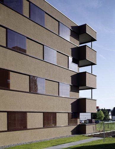 Lebendig wird das Fassadenbild durch die beweglichen, braunen Siebdruck-Glasscheiben die zugleich Sonnenschutz sind. Dazu passend ist der Putz des Massivbaus in warmen Braun gehalten.