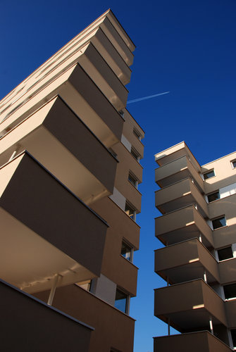 Der im Vorfeld projektierte Riegel entlang der Straße wurde seziert, aufgelöst in vier hohe Gebäude die städtebaulich selbstbewusst den großen Hof nach Süden umschließen und gegen die stark befahrene Rheinstraße abschirmen. Die Bauwerke entwickeln sich in die Höhe, ein achtstöckiges vertikales Reihenhaus, bei dem jeder seinen Nachbarn kennt und die Verantwortung für die gemeinsamen Zonen übernimmt. Der Typus des Zweispänners hat den weiteren verlockenden Vorteil, dass jede Wohnung von drei Seiten belichtet ist. Einfache, klare Grundrisse optimieren die knapp bemessenen Wohneinheiten.