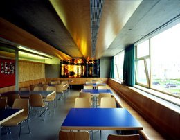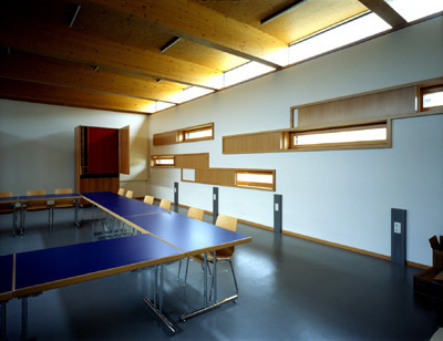 Trotz limitierter Formensprache und Materialwahl ist ein vielfältiges, lichtdurchflutetes und spannendes Raumgefüge von hoher Funktionalität entstanden. Spannung erzeugt der Wechsel von verschieden proportionierten Volumen: auf hohe Räume (z.B. mehrgeschossig und vertikal begehbar wie die Eingangshalle) folgen tiefe, langgezogene Räume. Direktes, indirektes, Streiflicht und Licht von oben wechselt je nach Raum.
