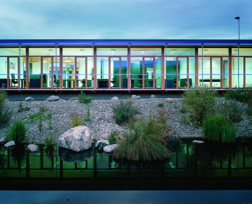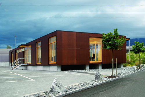 Für die Unterbringung der Büros wird die Länge von 12 x 2,40 Meter, also 28,80 m und eine Breite von 10 Metern gewählt. Durch den hohen Vorfertigungsgrad und das rasche Zusammenfügen an Ort und Stelle, war das Gebäude nach Baugenehmigung innerhalb von 2-3 Wochen bezugsfertig. Die einfache Bauteilfügung ermöglicht den raschen Ab- und Wierderaufbau. Ein vorgehängtes, überdachtes Terrassenelement zum bestehenden Biotop hin, dient den Mitarbeitern als Sonnenschutz und Relaxzone. (Text: Martina Pfeifer-Steiner)