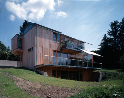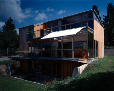 Die Spaziergänger staunen. Und diskutieren kopfschüttelnd darüber, daß hier, auf dem Südhang des Schafberges, mitten in einer der massiv gemauerten Einfamilienhauslandschaften, wie man sie in den „grünen“ Stadtrandquartieren gern findet, ein Holzhaus steht. Aber wahrscheinlich sind es gar nicht das Holz und seine so ganz und gar nicht rustikal-jodelnde Verarbeitung, die den Leuten zu schaffen machen. Nein, es ist das viele, großflächig und südseitig eingesetzte Glas.