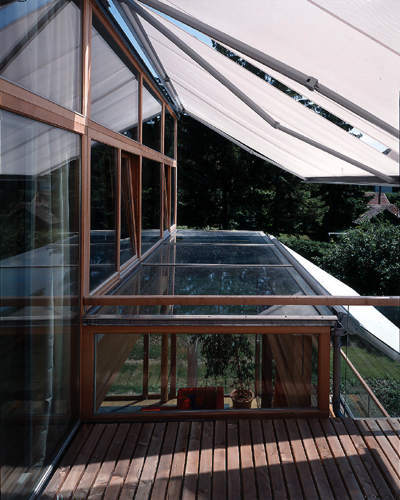 Die großflächigen Verglasungen (bis zu zwei Meter mal 3,60 Meter) haben einen außenliegenden Sonnenschutz. Sie sind nur zum geringen Teil fix, der weitaus größere läßt sich aufschieben. Reizvolles Detail: Vor den Fenstern der mehr privaten Bereiche - etwa der Schlafräume im Obergeschoß - gibt es Holzschiebeläden, die im offenen Zustand unsichtbar in der Fassade verschwinden, die sich aber auch so schließen lassen, daß eine glatte Holzhaut entsteht.