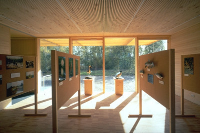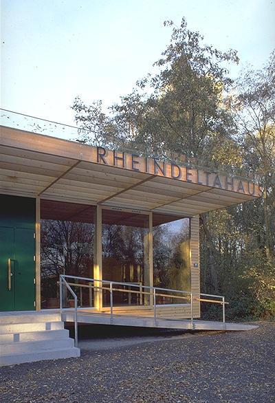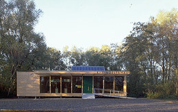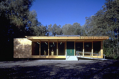 Der kubische Baukörper ist 3-seitig geschlossen, auf der Südseite fast durchgehend verglast und mit einer horizontalen Lamellenkonstruktion beschattet. Die notwendigen Nassräume sind als eigenständiger Körper an den kubischen Hauptbaukörper angesetzt und mit einem steilen Dach versehen, in welches die Fotovoltaik-Anlage integriert ist. Eine optimierte Gebäudehülle sowie eine Abluftwärmerückgewinnung garantieren einen sehr niedrigen Energieverbrauch. (Text: Architekt)