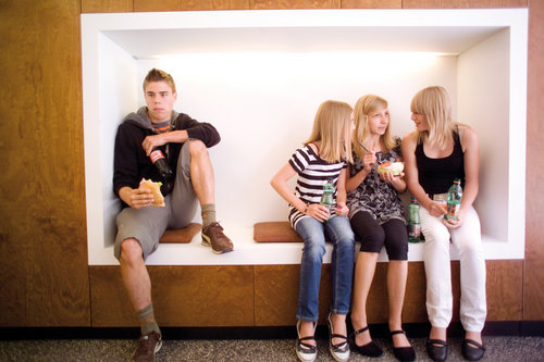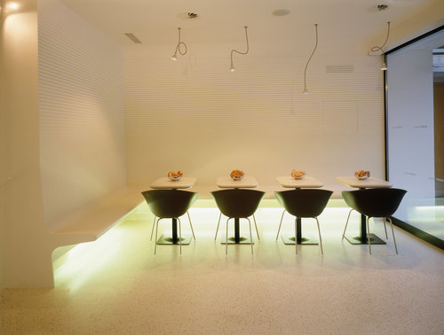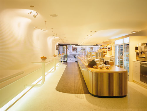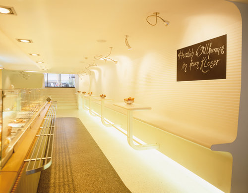 Durchlässigkeit zwischen Kaiserstraße und Leutbühel wird in Bäckerei/Cafe nicht nur optisch ermöglicht. Der Häuserblock wird gequert und die Einkäufe sind erledigt. Das in Weiß und eher abstrakt gehaltene Cafe steht zu seinem Design. Die Lampen geben die Freiheit der Improvisation, des sich nicht festlegen, und gleich wieder weiter zu können. Geerdet wird mit der handfesten Theke, wo es alles gibt, was gut und knusprig-frisch ist. (Text: Martina Pfeifer-Steiner)