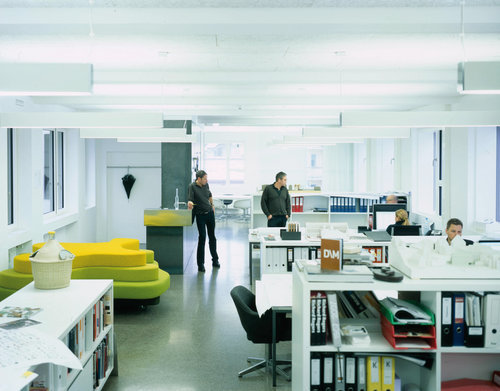 Nicht nur ein Bürokomplex in der Innenstadt solle es sein, sondern ein kommunikationsförderndes, interaktives Ambiente, mit breit gefächertem Nutzungsmix der Mieter: vom Kinderazt, über einen Verlag, das selbige planende Architekturbüro, bis hin zur Reinigungsfirma fanden dieses Raumangebot attraktiv.