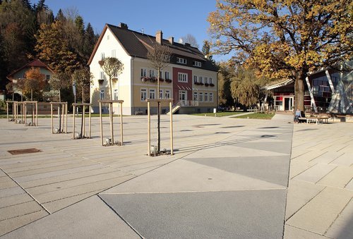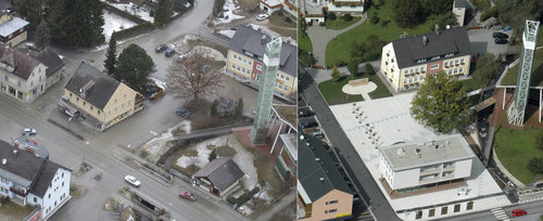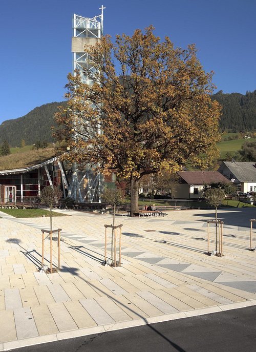 Aus dem ehemals ungenutzten Nischenraum zwischen Kirche, Gemeindeamt und Schule wurde nun ein Hauptplatz konzipiert, der sich - nach langer Planungsphase - ungemeiner Beliebtheit und Frequenz erfreut. Als Bodenbelag dienen großformatige, „lisenenförmige“, bewehrte Betonsteine in drei Farben, für die Gehwege und Verbindungsachsen Dreiecksplatten mit bis zu 3 m Seitenlänge. Beide wurden für den Hauptplatz extra entworfen und gegossen.