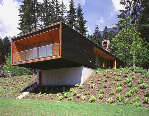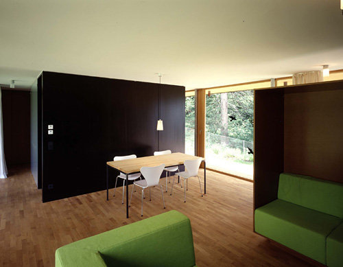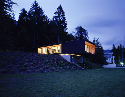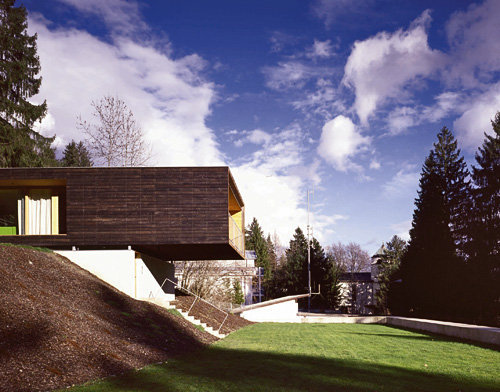 Das Bildungshaus „Seehof“ der Kammer für Arbeiter und Angestellte für Tirol wurde 2001 um eine Tiefgarage und ein Personalhaus erweitert. Am Waldrand präsentiert sich markant der schwebende Holzbaukörper des Personalhauses. Der Betonkubus der Tiefgarage integriert sich in das begrünte Hanggelände und ist nur an der Straßenseite sichtbar. Ein horizontaler Lichtschlitz verläuft über die gesamte Sichtbetonvorderansicht zwischen Wand und Deckenplatte und mündet in die quadratische Einfahrtsöffnung. Das leicht ansteigende Gelände entlang der Straße verdeutlicht die Dominanz der Landschaft und verleiht der Straßenansicht Dynamik.Raumhohe Öffnungen durchbrechen in alle Himmelsrichtungen den schwarz gefärbten Lärchenholzmantel. Es entstehen überdachte Terrassenflächen mit unbehandelter sägerauer Lärchenholzlattung. Schiebeelemente öffnen im Bereich der Loggien den Wohnraum. Innenwände und Schrankverbauten aus schwarzen und naturfarbenen MDF-Platten geben die klare Innenraumgestaltung der zwei Wohnungen vor. Weiträumige Ausblicke bestimmen neben der Holzbauweise das Raumgefühl.