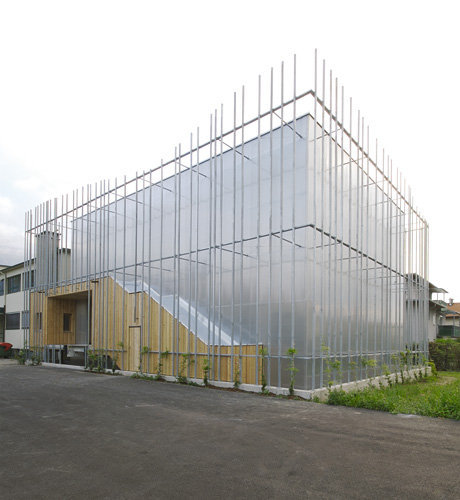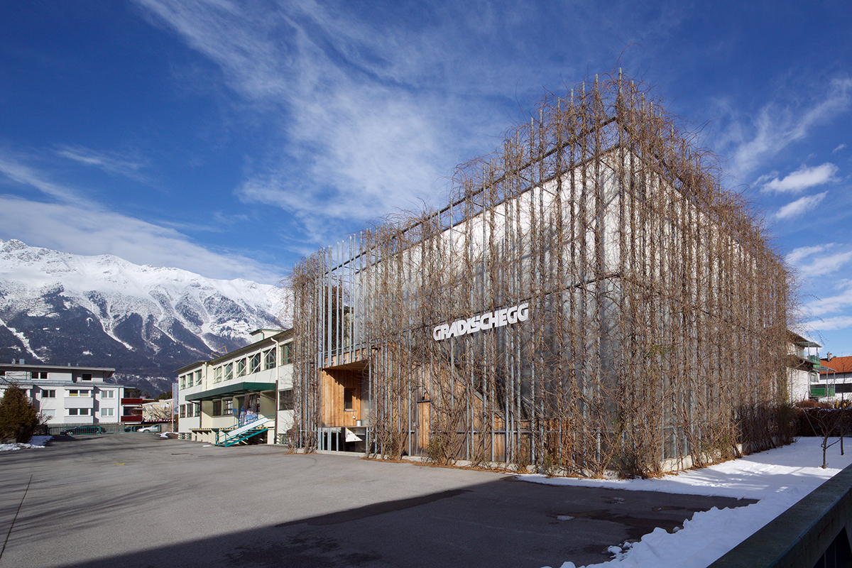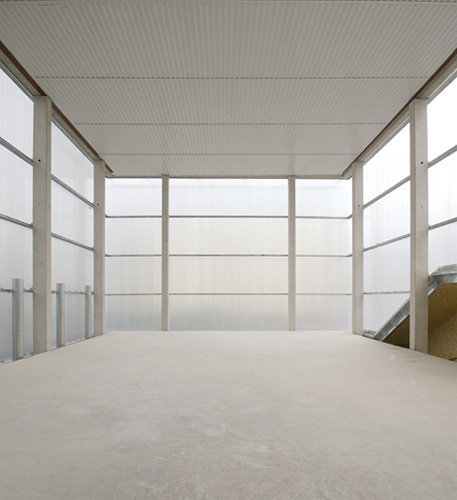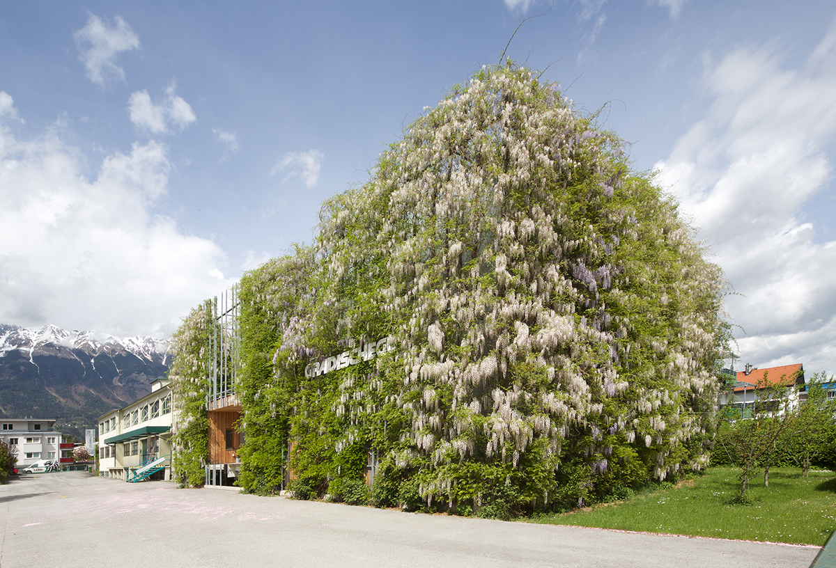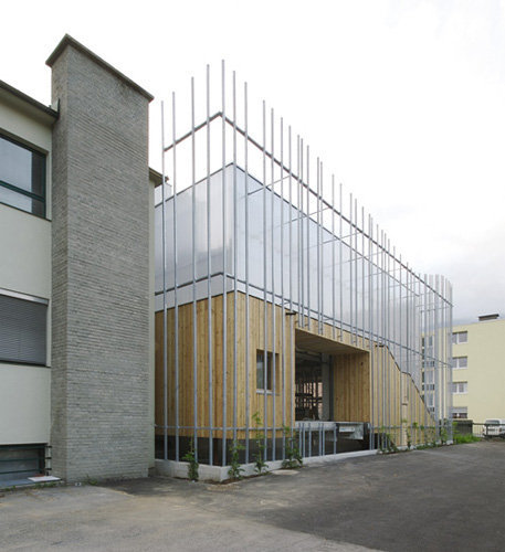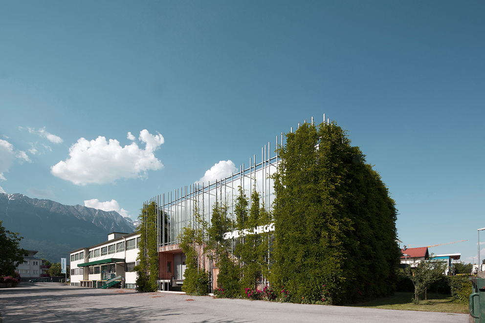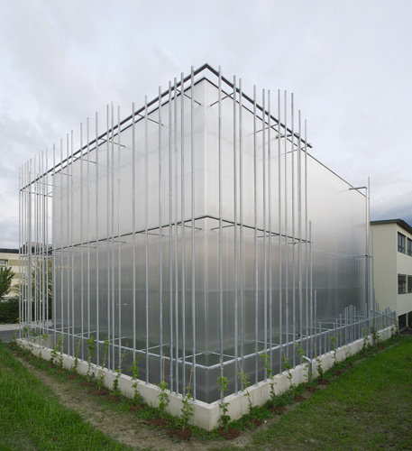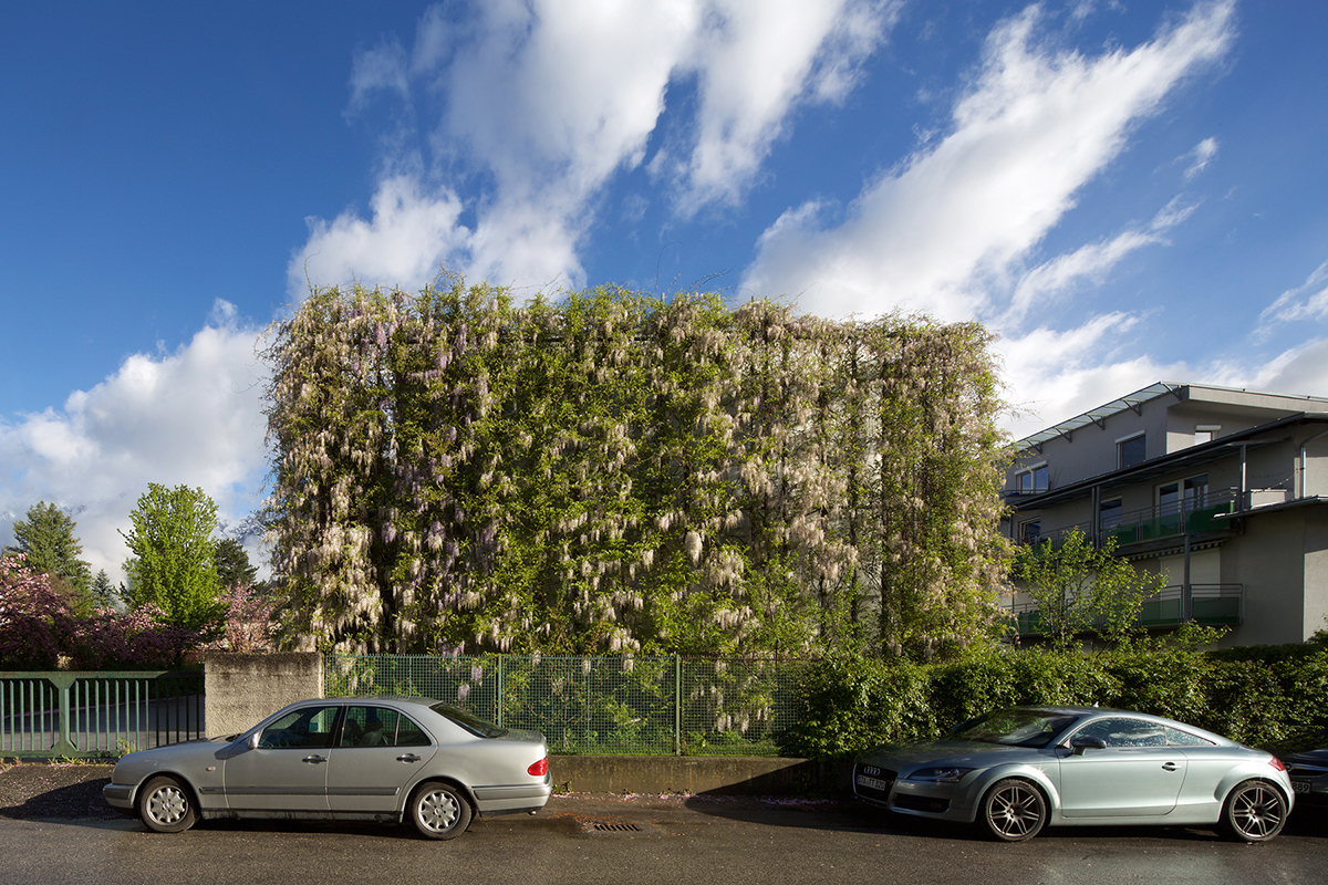 Die Fassade des Lagers besteht aus transluzenten, 40 mm starken Polycarbonatplatten, jeweils 50 cm breit und 12 m hoch. Sie sind an horizontal umlaufenden Stahlprofilen montiert. Die Fassaden der im Zwischenraum gelegenen Kubaturen sind mit Lärchenholz verkleidet. Die auf die Mauerkrone aufgesetzte verzinkte Stahlkonstruktion dient als Rankhilfe für umlaufend gepflanzte Wisteria-Rabatten. Im Sommer bietet der Bewuchs Beschattung, während die Pflanze im Winter nach Verlust der Blätter eine passive Sonnenenergienutzung ermöglicht. Die Wisteria (Glyzinie) ist eine robuste, stark wachsende, verholzende Kletterpflanze (Lianen). Der Aspekt der Verholzungen wird über die Jahre ein wichtiges Element im Erscheinungsbild des Gebäudes. Das Wechselspiel aus vertikalen Stahlstäben und sich in die Vertikale entwickelnde Wisteria-Stämmen lassen ein reizvolles Bild an der Fassade erwarten. (Text: Architekten)