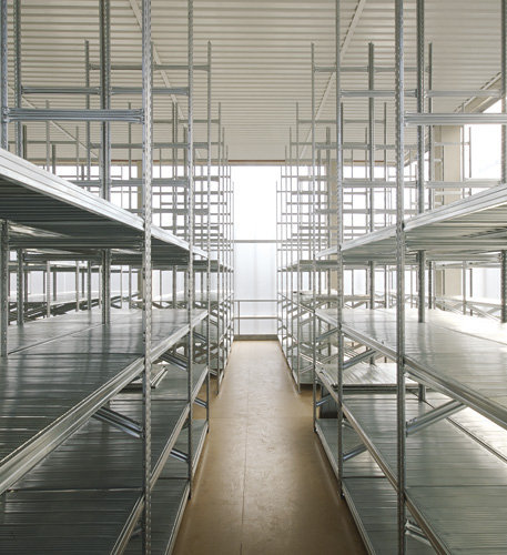 Das Gebäude ist in eine in das Gelände eingepasste Stahlbetonwanne gesetzt. In Abhängigkeit von Fassadenausrichtung und Funktion divergiert der zwischen Stahlbetonwanne und Baukörperfassade entstehende Raum zwischen einem und 2,30 m Breite. Dieser Raum wird ab Oberkante Mauerkante mit einer Stahlkonstruktion gefasst. Der zwischen Stahlkonstruktion und Lagerhalle vorhandene Zwischenraum ermöglicht die natürliche Belichtung des gesamten Palettenregallagers im Untergeschoss. Er beherbergt an der Westfront das Lagerhalterbüro, den Verladerampenbereich sowie die einläufige Treppe ins Untergeschoss. Durch das Auslagern dieser Sekundärfunktionen in den Zwischenraum können die Lagerhalterflächen uneingeschränkt mit Regalsystemen bespielt werden.