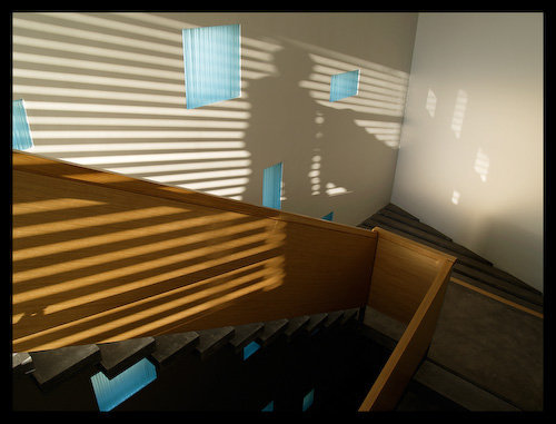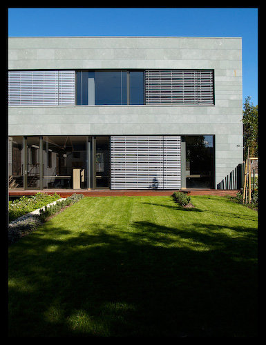 Our client was a firm specialized on planning and carrying out of sun protection systems. We were expected to plan a building which would not only host the head office but also become an emblem of the firm’s philosophy of uncomprimising devotion to quality. The house intends to demonstrate a harmonic unity of architecture and shading technology instead of being tricked up by forced decorating elements. We were encouraged to find solutions that need more mental energy investment rather than physical so that running costs could be reduced.