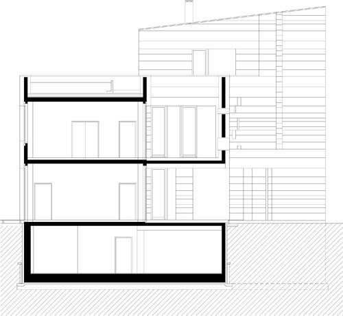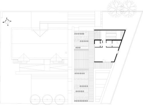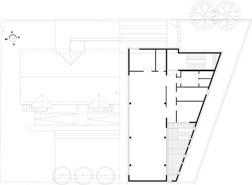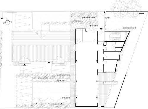 The building site lies in a confused outer area of Budapest. The longer street side of the acute-angled trapezoid corner site follows an esplanade and cycle path along the Danube bank while, the shorter one faces a warehouse area. The fourth side neighbours a small house suburban surrounding. The area being architecturally mixed, we wanted to create something of quality which would also look a novelty as against the adapting. We opted for a sculpture-like, conspicuous outer shape which would mark the building off from its environment. The two street sides of the house look like a solid but textured mass that has been punched and crushed here and there. On the other hand, the opposite long side opens widely to an intimate garden enclosed by an existent house beside. The mass of the building fills up the space allowed by the building regulations while leaves inner terraces (i.e. hidden outer spaces) beside the functional rooms within the strict outlines.