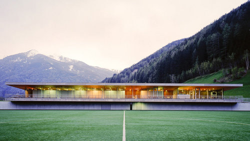 Das Projekt soll sich in Form eines möglichst niedrigen, eingeschossigen Baukörpers zurückhaltend in den umgebenden Landschaftsraum einfügen. Die vom Spielfeld abgewandte Seite des Gebäudes zeigt sich als völlig geschlossener, hölzerner Rücken, während die Fassade entlang des Zuschauerbereiches als durchgehende Glasfront ausgebildet ist. Sportler und Zuschauer sind nur durch die Glasschicht voneinander separiert, alle Nutzungen und Aktivitäten nach innen und außen sind für Besucher und Sportler gleichermaßen einsehbar.