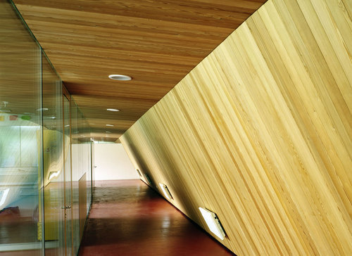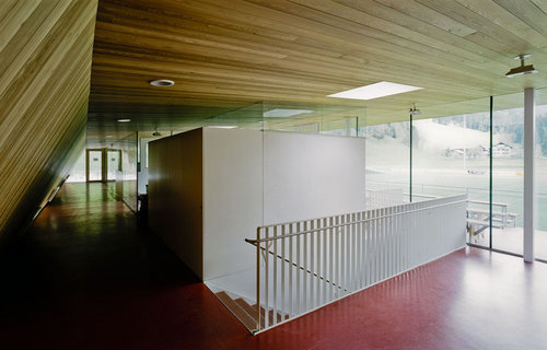 Das Projekt bedient sich weniger Details und Materialien. Mit Ausnahme des kleinen unterkellerten Teils ( hinter der Geländestützmauer in Ortbeton ) ist der überirdische Baukörper in Holzbauweise mit 30cm Dämmstärke realisiert worden. Für alle der Witterung ausgesetzten Fassaden- und Dachflächen wurden sägerauhe Bretterschalungen in Lärche verwendet, welche ähnlich der traditionellen Schindeldeckung der umgebenden Bauernhäuser das neue Gebäude mit der Landschaft verschmelzen lassen. Ebenso erhielt der gesamte Innenraum des Gebäudes samt Zuschauerbereich im Freien eine hölzerne Untersicht mit Lärchenschalungen. (nach einem Text der Architekten)