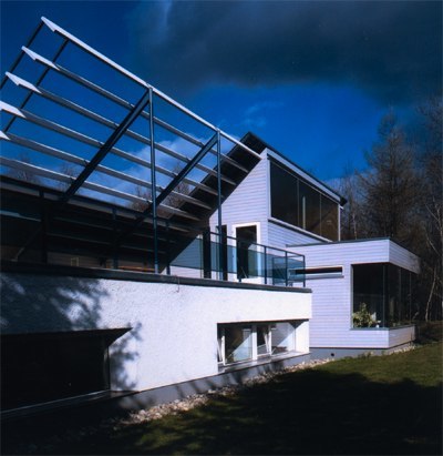 Dieser Steg formt eine Distanz um das Haus und stellt es somit als Solitärgebäude in der Wiese dar. Die Schlafzimmer sind in einer massiven „Schachtel“ aus Ziegelmauerwerk untergebracht , die bis zum Parapeth in der Böschung steckt, das Dach wird als begehbare Dachterrasse genutzt. Die Nebenräume, Bad, WC und Wirtschaftsraum schließen sie gegen Norden ab. Der Wohnbereich ist ein Grossraum in Holzkonstruktion mit grosszügigen Verglasungen nach Süden und ins Grüne.