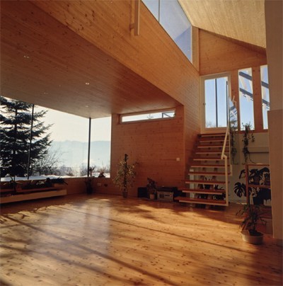 Die grosszügige Südverglasung trägt insgesamt positiv durch die passive Solarnutzung bei. Die Schlafzimmer schützt die hohe Speichermasse vor Überhitzung, die schmalen Fenster sitzen tief in der Mauerleibung, gut beschattet. Die grossen Fenster im Wohnzimmer werden im Sommer von den dichten Birken beschattet. Das grosse Raumvolumen und das Baumaterial Holz trägt mit zu einem ausgezeichneten Raumklima bei. (Text: Architekt)