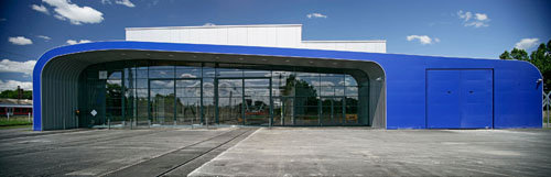Glass walls and plum blue coloured Alucobond cladding were used for the end façades. The large glazed double industrial doors (5x4 m) have an individual steel structure and are moved by electricity. Zsolt Hajnal