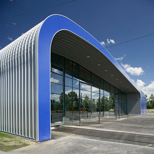 The silver-coloured, curved metal covering is closed by large glass walls on the end façades – like a secant plane – and by deep blue Alucobond cladding on the solid surfaces.