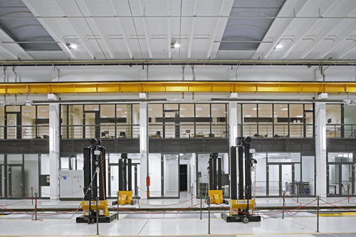 The offices on the gallery receive natural lighting from the strip of windows above the wheel lathe hall and are in direct contact with the maintenance hall through the glass wall onto the gallery.