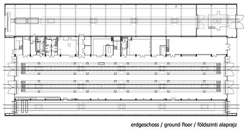 The maintenance hall, despite its large solid wall surfaces, is a light workshop with a good atmosphere. Light enters the large hall through the bands of fixed skylights on the roof, the glass surface of the end façades and the glass front of the office strip on the gallery level, where light colours, off-white and light grey, dominate.