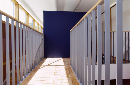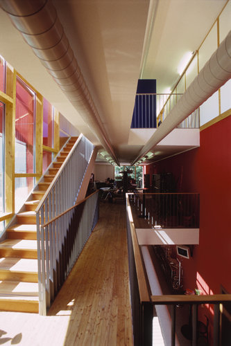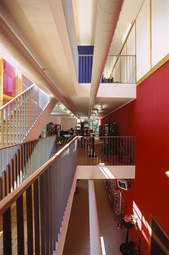 Im Erdgeschoß des neuen Geschäftsgebäudes sind der Schauraum sowie der Verkaufsbereich im Atrium situiert. Dahinter befinden sich Archiv, Computer- und Telefonzentrale. Im Obergeschoß wurden die Büroflächen neu organisiert und ein zusätzlicher Büroraum errichtet. Das Dachgeschoß wird als Pausen- und als Erholungsbereich genutzt, hier befinden sich Teeküche, WC und Dusche. Neben der Haupterschließung über die Treppe im Atrium besteht eine weitere Fluchtmöglichkeit aus den Obergeschossen über eine im Innenhof liegende Stahltreppe.
