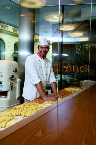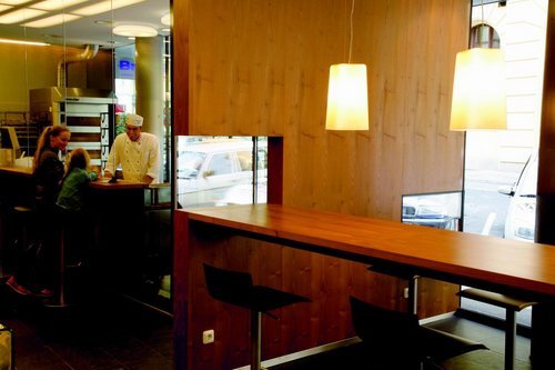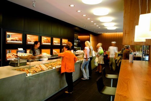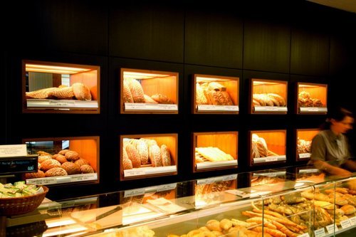 Die gläserne Backstube wurde zwischen Straße und Verkaufsraum angeordnet und ermöglicht somit allseitige Ein- und Durchblicke. Kunden und Bäcker teilen sich als Hauptfiguren die selbe Bühne. Ein monolithisches Verkaufspult aus Beton und Wände aus schwarzem MDF bilden den reduzierten Rahmen für die Waren, die Schmuckstücken ähnlich in Schaukästen präsentiert werden.
