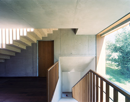 Das 3,25 m hohe Wohngeschoss liegt auf einer Ebene mit dem Garten, wobei eine Geländestufe sich auch im Innenraum fortsetzt und die höher gelegene Wohnebene vom Essbereich trennt. Im ersten Obergeschoss befinden sich drei Kinderzimmer und ein Kinderbad, welche sich um einen überbreiten Korridor anordnen, der westlich und östlich in Ganzglas ausgebildet ist und die Aussicht zum Botanischen Garten und auf die Berge im Westen ermöglicht. Das oberste Geschoss ist den Eltern vorbehalten und profitiert von der großen Terrasse. Das Untergeschoss ist an die eingeschüttete Garage angeschlossen. Die Massivholztreppe, die seitlich in den Sichtbetonwänden befestigt ist, ändert im Obergeschoss die Richtung und bildet dadurch einen Weg durchs Haus, der bis auf die Dachterrasse führt. (Text: Architekt)