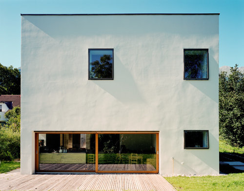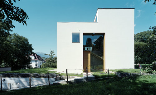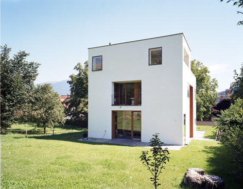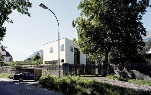 Großflächige Verglasungen wurden in dem sonst monolithisch angelegten Baukörper möglichst unauffällig ausgenommen und geben dem Innenraum seine lichte und moderne Ausstrahlung. Die reduzierten Fassaden kommen ansonsten mit wenigen, einzeln gesetzten Fenstern aus, die flächenbündig mit der Putzebene sind. Der kubische Ausdruck des Baukörpers wird durch einen Ausschnitt in der obersten Ebene verstärkt. Das Gebäude wurde in Massivbauweise aus einschichtigem Mauerwerk errichtet, welches ohne weitere Dämmung Niedrigenergiestandard aufweist und die Verwendung von traditionellem Kalkputz und besonders feiner Kalkglätte erlaubt. Im Garten und entlang der Strasse finden sich Mauern aus „Höttinger Brecchie“, einem örtlich abgebauten Konglomeratgestein, das über die Jahrzehnte auch in der restlichen Stadt immer wieder verwendet wurde.