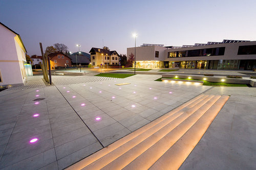 Am Eingang des Platzes, als regionaler Wegweiser, wird ein Brunnen mit Lichtanzeiger errichtet, der den Platz zwischen Bühne/Podium und Einfahrtskreuzung fasst. Die Bühne ist zentrales Element des Platzes. Sie rahmt einerseits den südlichen Platz und bietet Raum für Veranstaltungen aller Art. Sie teilt den Platz in Aufenthalts- und Fußgängerzone südlich und Parkplatz und Verkehrszone nördlich. Licht war ein wesentlicher Bestandteil der Geschichte Trofaiachs. Schon das Wappenzeichen, der Nachtwächter, belegt die Position Trofaiachs, als einen an der steirischen Eisenstraße gelegenen, wichtigen und sicheren Ort des Transportweges.
