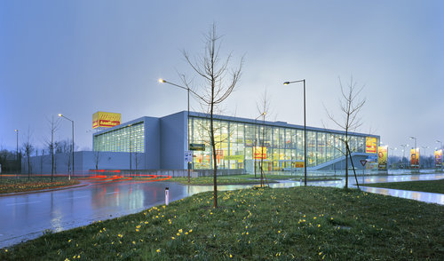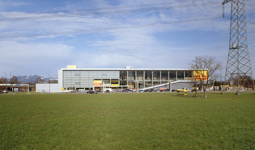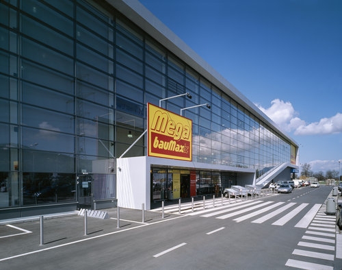Bei der Betonfertigteilkonstruktion der Halle wurde jede Stütze statisch optimiert. Stützen und Träger variieren in der Dimension nach abgetragenen Lasten. Um den Außenbereich der Gartenabteilung geordnet zu halten, wird die Fassade als uneinsichtige Innenhofwand weiter gezogen. Die drei beabsichtigten Werbewürfel am Dach des Gebäudes konnten auf einen – kleineren – reduziert werden. (Text: Martina Pfeifer-Steiner)