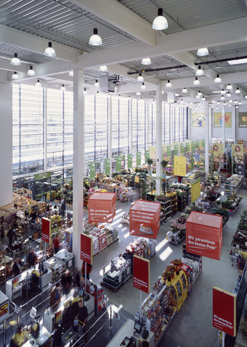Die verglasten, offenen, freundlichen Seiten im Süden und Osten schauen zur Stadt. Geschlossen, aufgeräumt, mit Fassaden aus Blech stehen die übrigen Fronten zur Autobahn. Im Baumarkt, der jeden Zentimeter nutzt um den Patchworkteppich des Produkte-Sammelsuriums auszubreiten, ist Orientierung und Raumempfinden wesentlich. Über den doppelläufigen Rollsteig entlang der Glasfassade ist die imposante Größe des Bauwerkes zu erfassen und erleben. Großzügig wirkt auch der zweigeschossige Teil des Gartencenters im Süden. Die übrigen Abteilungen -Schwerlastabteilung im EG, Werkzeuge und Raumausstattung im OG - sind einstöckig. Wer in den Regalschluchten verloren zu gehen droht, orientiert sich nach dem Lichteinfall.