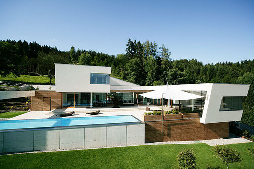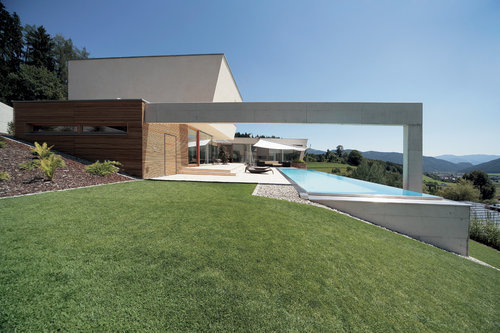 Also setzte sie die Edelvariante eines Hofhauses in den Hang: Wie auf einem Tablett schwebt es auf der Kellerdecke über der Landschaft. Nach außen geschlossen, innen offen, fasst es L-förmig eine Terrasse mit Swimmingpool ein. Der Freiraum wird so zu einem integrativen Bestandteil des Hauses, die Nachbarn werden auf diese Weise komplett ausgeblendet. Damit war auch das letzte Wunschkriterium erfüllt. Kein Jahr später stand das Haus. „Wir zeichneten teilweise den Baggern hinterher“, erinnert sich die Architektin.