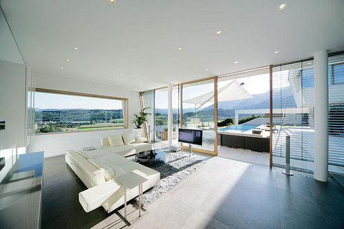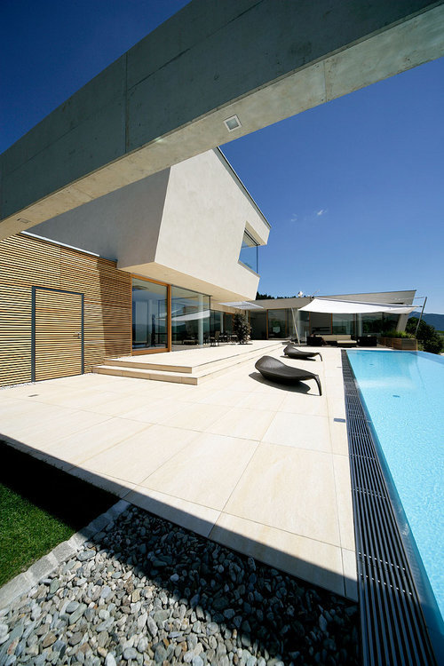 „Die schönste Aussicht ist im Süden und Westen. Da hat man das ganze Panorama übers Tal“, sagt die Architektin, „wir wollten den Innenraum zum Außenraum machen.“ An schlanken, runden Stützen mäandern raumhohe Glasfassaden an den sonnigen Filetseiten die Terrasse entlang. An den Rändern der Terrasse scheint der Wasserspiegel des Pools nahtlos in den Horizont zu kippen.