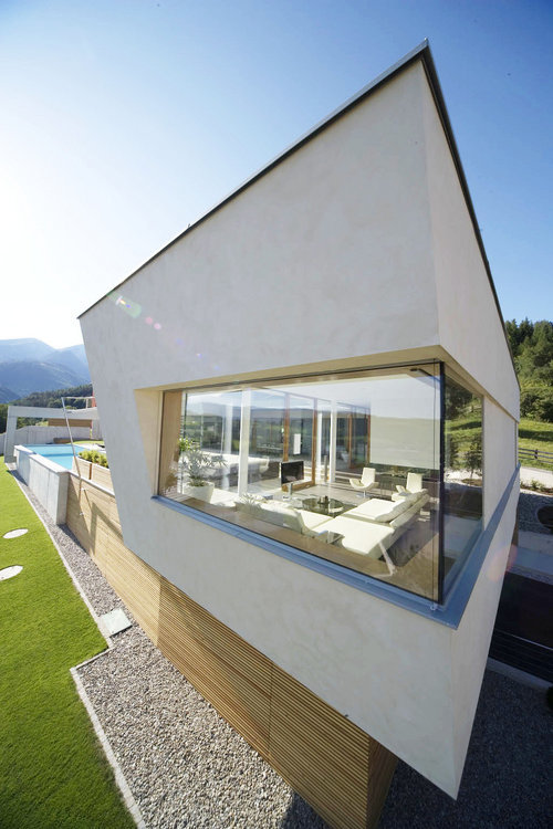 Mit einer Steigerung der Höhen und Perspektiven wird im Westen die Raumfolge von Kochen übers Tafeln bis hin zum Wohnen zelebriert. Mit einer Schiebetür öffnet sich der Essplatz zur Terrasse. Als optische Zäsur hängt eine weiße Kaminwandscheibe von der Decke, hinter Glas lodert an kühlen Tagen ein Feuer. Eine Stufe tiefer liegt der 3,60 Meter hohe Wohnbereich mit Zugang ins Freie. Weit reicht hier der Panoramablick. Wie in einem Cockpit schwebt man da über die Landschaft, wie eine Skulptur rahmt ein Betonbalken den Blick aufs Pool. „Der Bügel hat nur einen Zweck. Er soll den Nachbarn verdecken“, gesteht Architektin Marion Wicher. Den erfüllt er mit hohem ästhetischen Mehrwert. Outdoot-Dusche und Abendlicht stecken außerdem da drin.