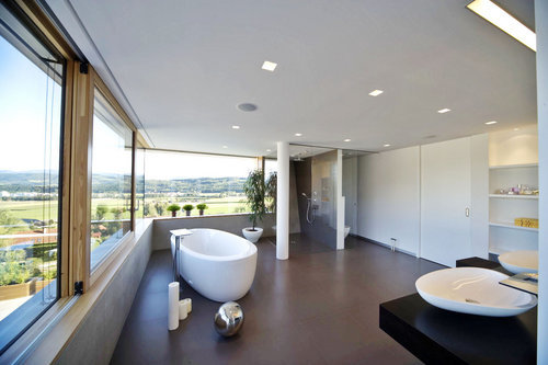 Darüber schwebt die Wohnebene in weltgewandter Weitläufigkeit über den Hügel. Wie in einem Museum wird der Blick von diesem Hauswinkel gerahmt. An der Treppe im Norden fängt ein schmales Fenster das angrenzende Bauern-idyll ein, im Osten flutet die Morgensonne durch hohe Öffnungen den Essplatz und die zwei Küchen - eine für die dezente Entsorgung der Abwasch, die andere mit freistehendem Herdblock zum genussvollen Kochen.