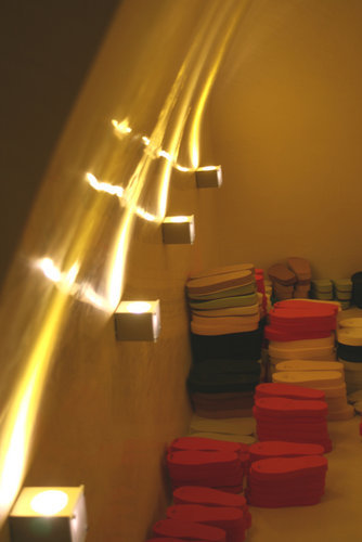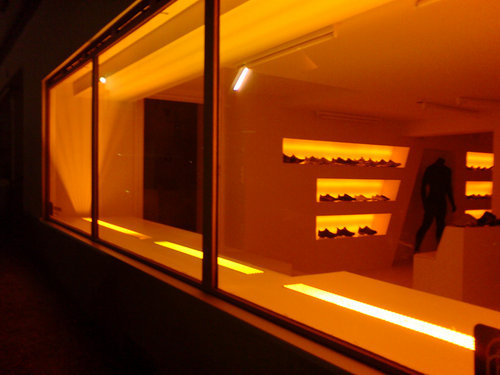 Die Möbel sind vollständig integriert und einfarbig weiß. Sitzbänke wachsen aus dem Boden heraus, Schuhregale und Ablagen sind Ausschnitte in den Wänden. Mit tansluzentem, farbig beleuchtetem Plexiglas an den Rückwänden werden Schuhe sowie Einlagen inszeniert. Ein abgetrennter Loungebereich bietet Platz für Präsentationen, die Lichtschlitze in den Wänden zum Verkaufsraum schaffen Atmosphäre. (Text: Martina Pfeifer-Steiner)